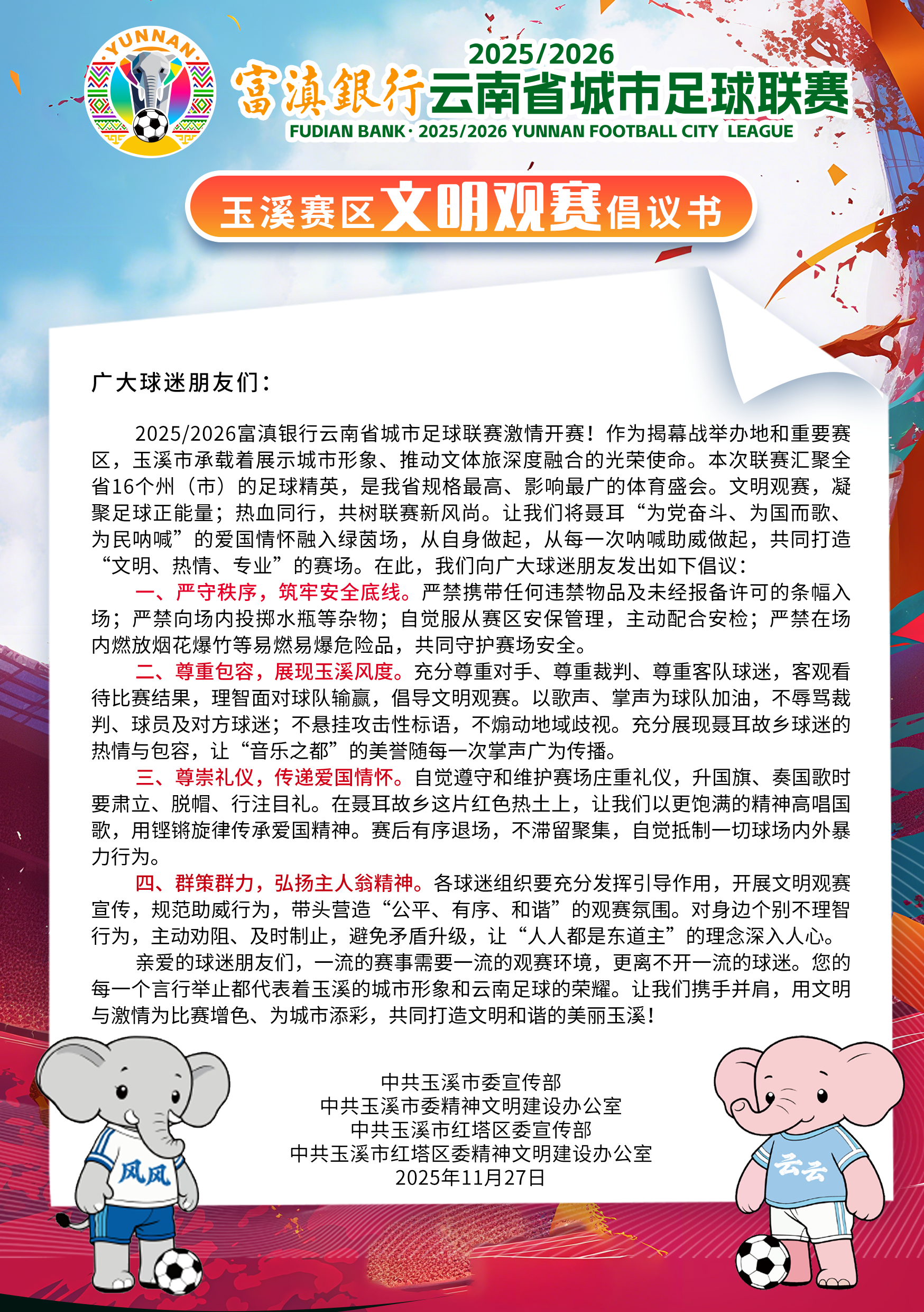 亲爱的球迷朋友们,一流的赛事需要一流的观赛环境,更离不开一流的球迷。您的每一个言行举止都代表着玉溪的城市形象和云南足球的荣耀。让我们携手并肩,用文明与激情为比赛增色、为城市添彩,共同打造文明和谐的美丽玉溪!