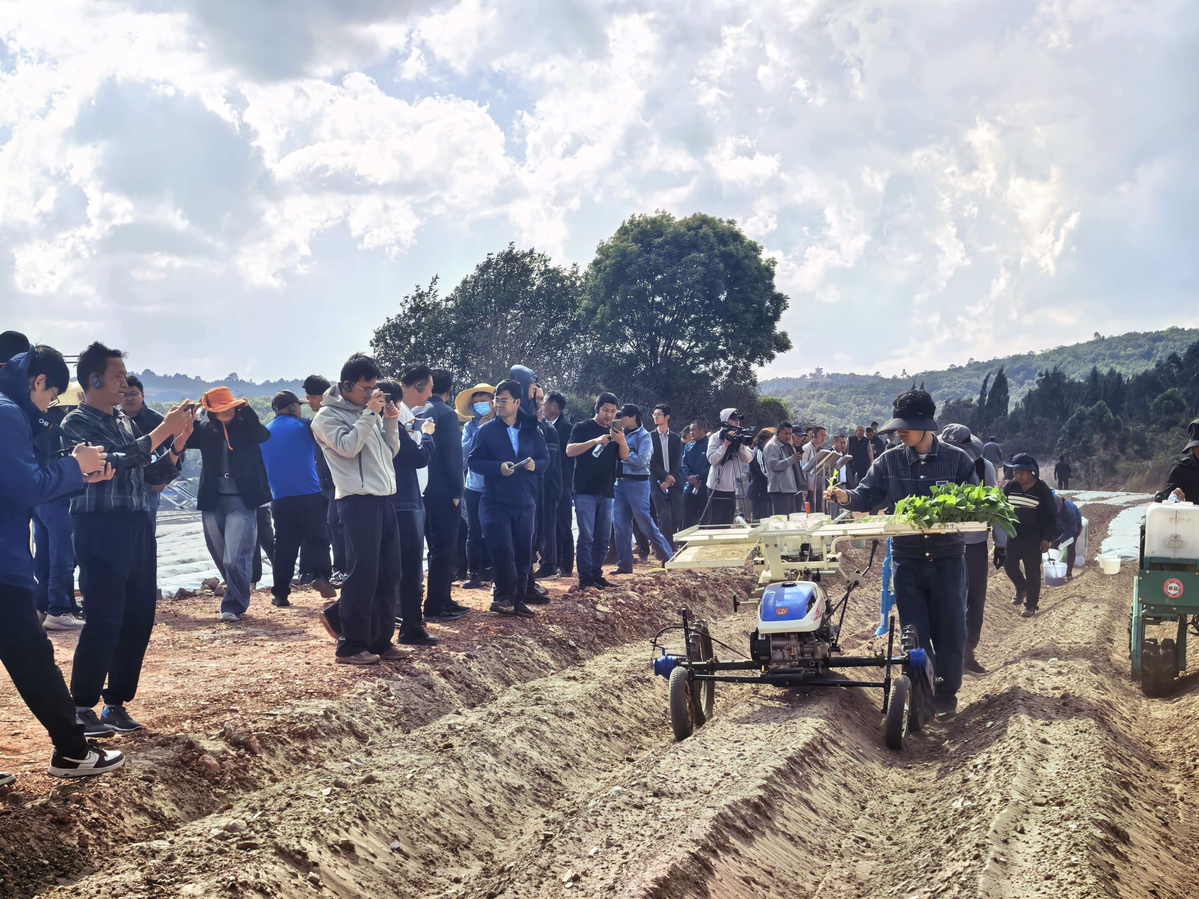 在高仓街道龙树社区小坝烤烟千亩连片种植区抗旱移栽现场,参会人员观摩了“耕地—起垄—移栽—覆膜”全程机械化作业展示,区烟草公司相关负责人作技术讲解。在机械化与绿色化融合展示区,机械化移栽配套杯罩抗旱移栽、烤房装卸烟设备、起垄打塘等作业依次呈现,残膜捡拾机、液压弹齿式残膜回收机等清洁生产设备同步亮相,展示了从生产到环保的全链条机械化水平。